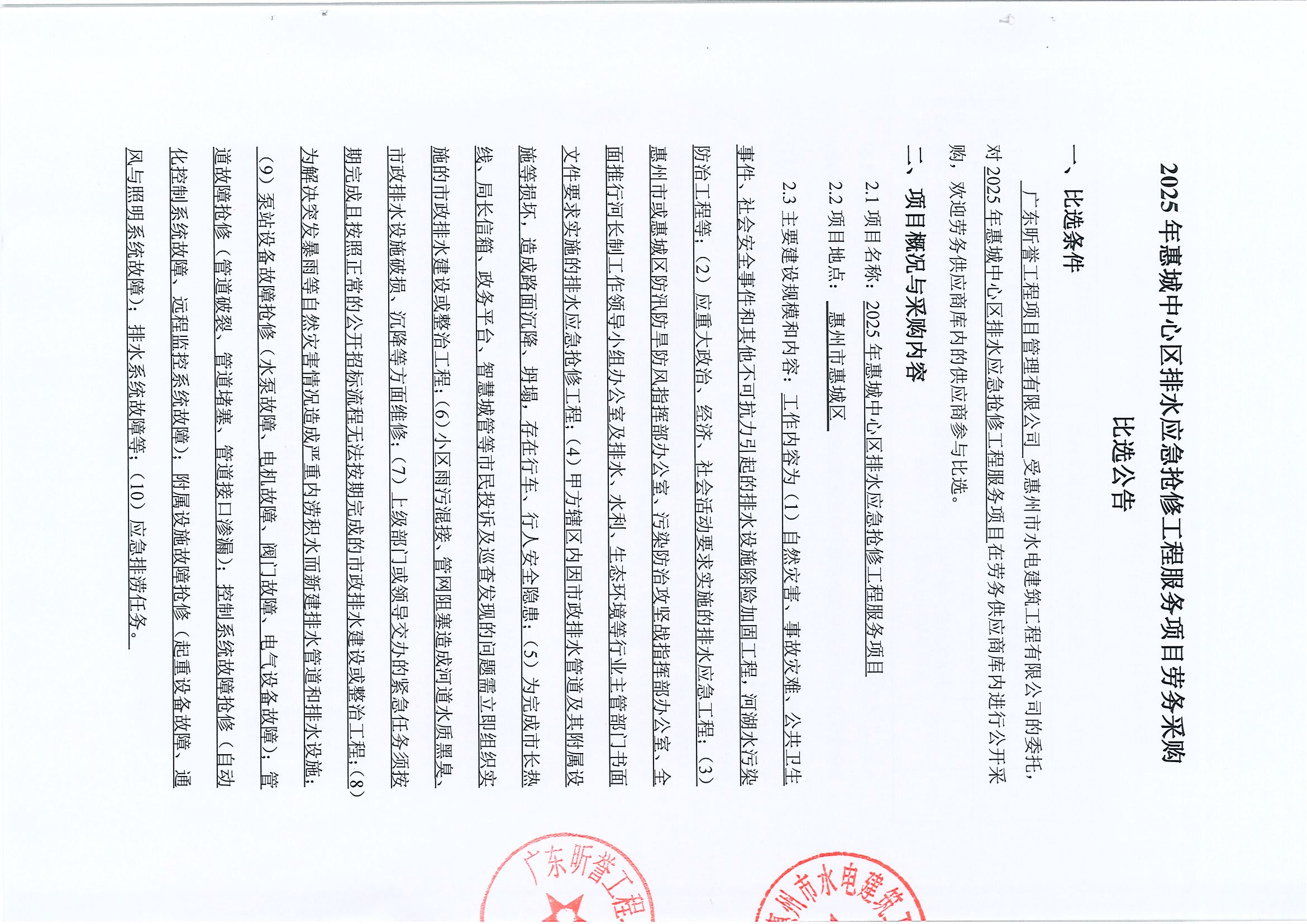 2025年惠城中心區(qū)排水應(yīng)急搶修工程服務(wù)項(xiàng)目勞務(wù)采購(gòu)比選公告