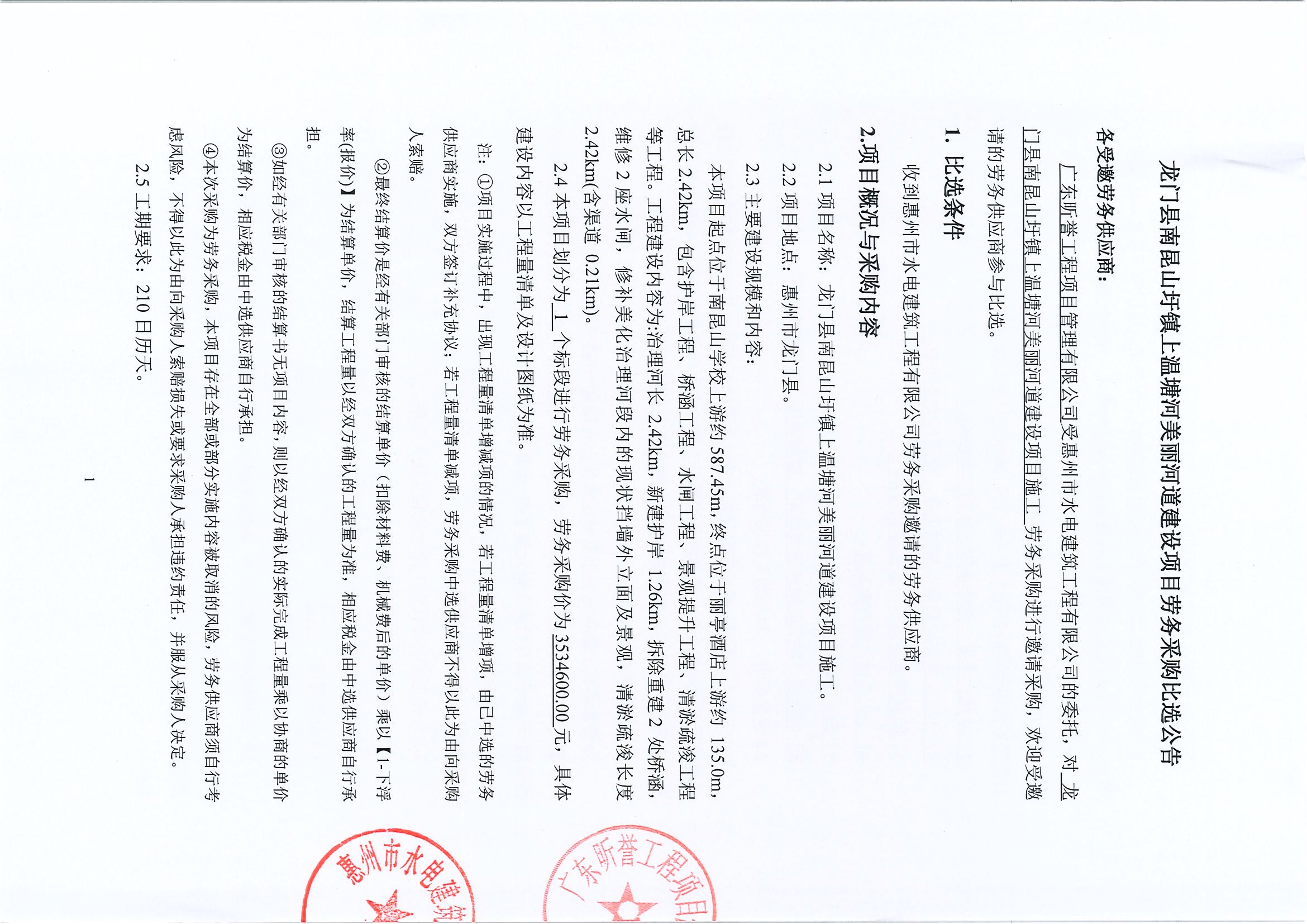 龍門縣南昆山圩鎮(zhèn)上溫塘河美麗河道建設項目勞務采購比選公告