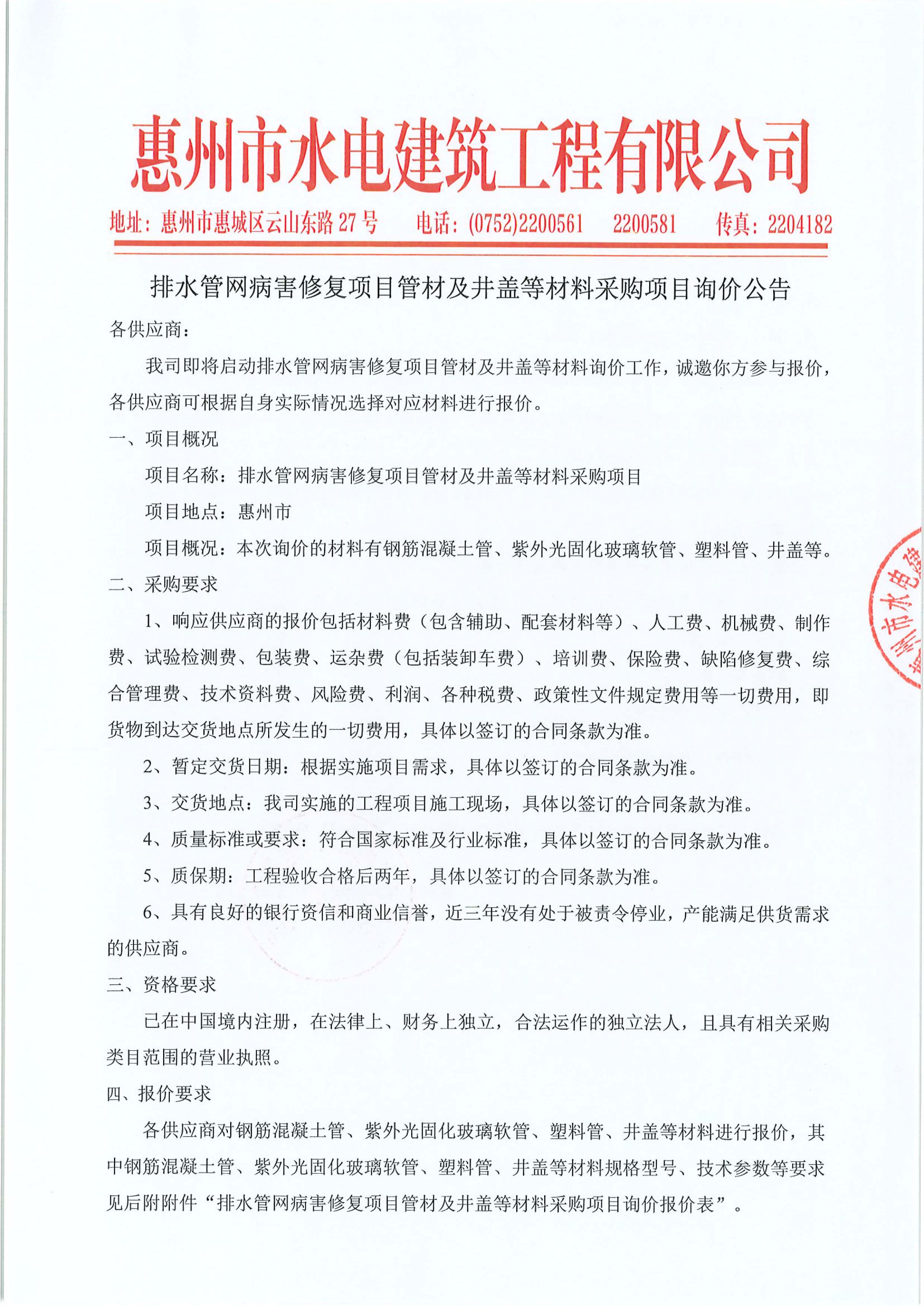 排水管網(wǎng)病害修復(fù)項目管材及井蓋等材料采購項目詢價公告