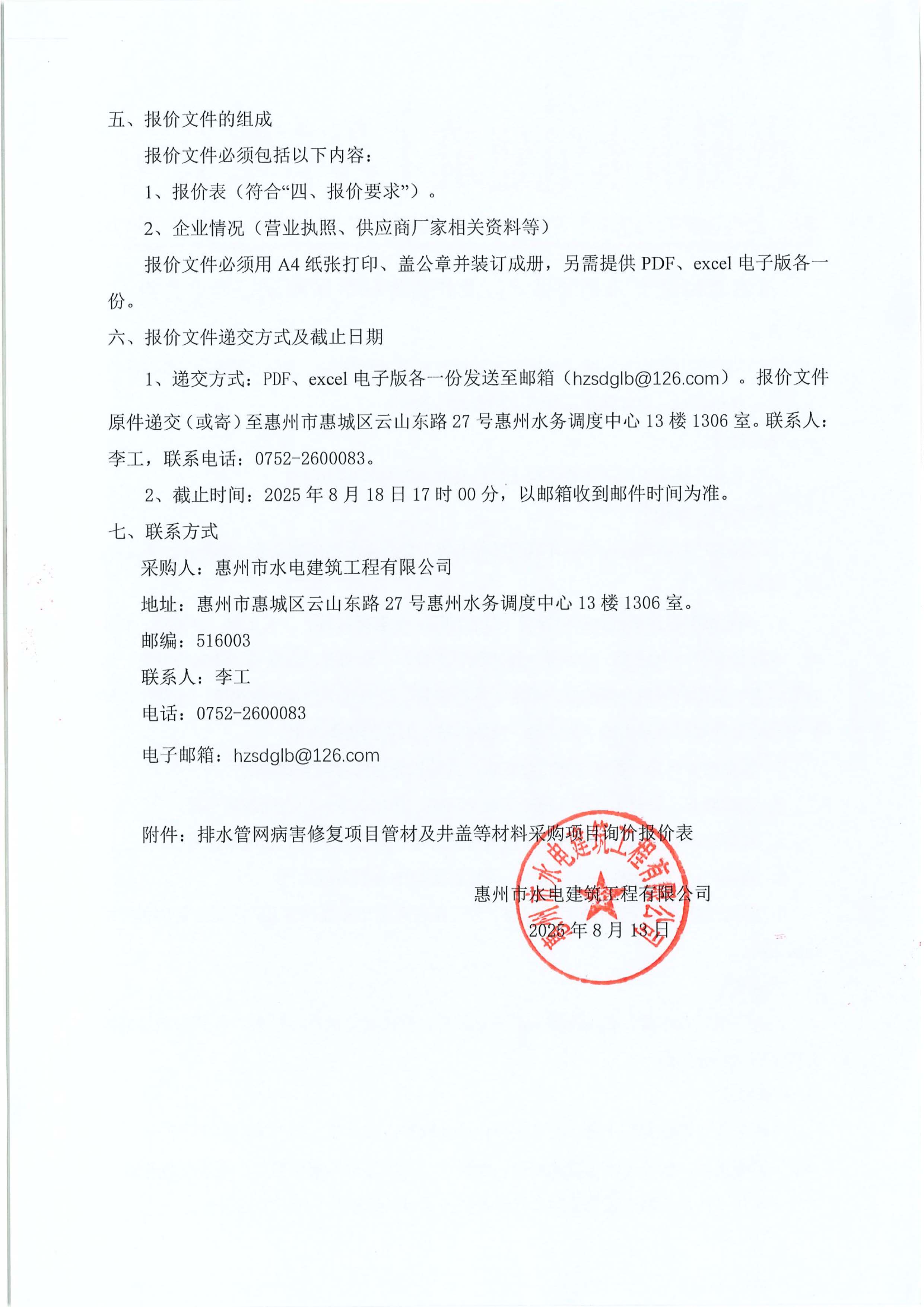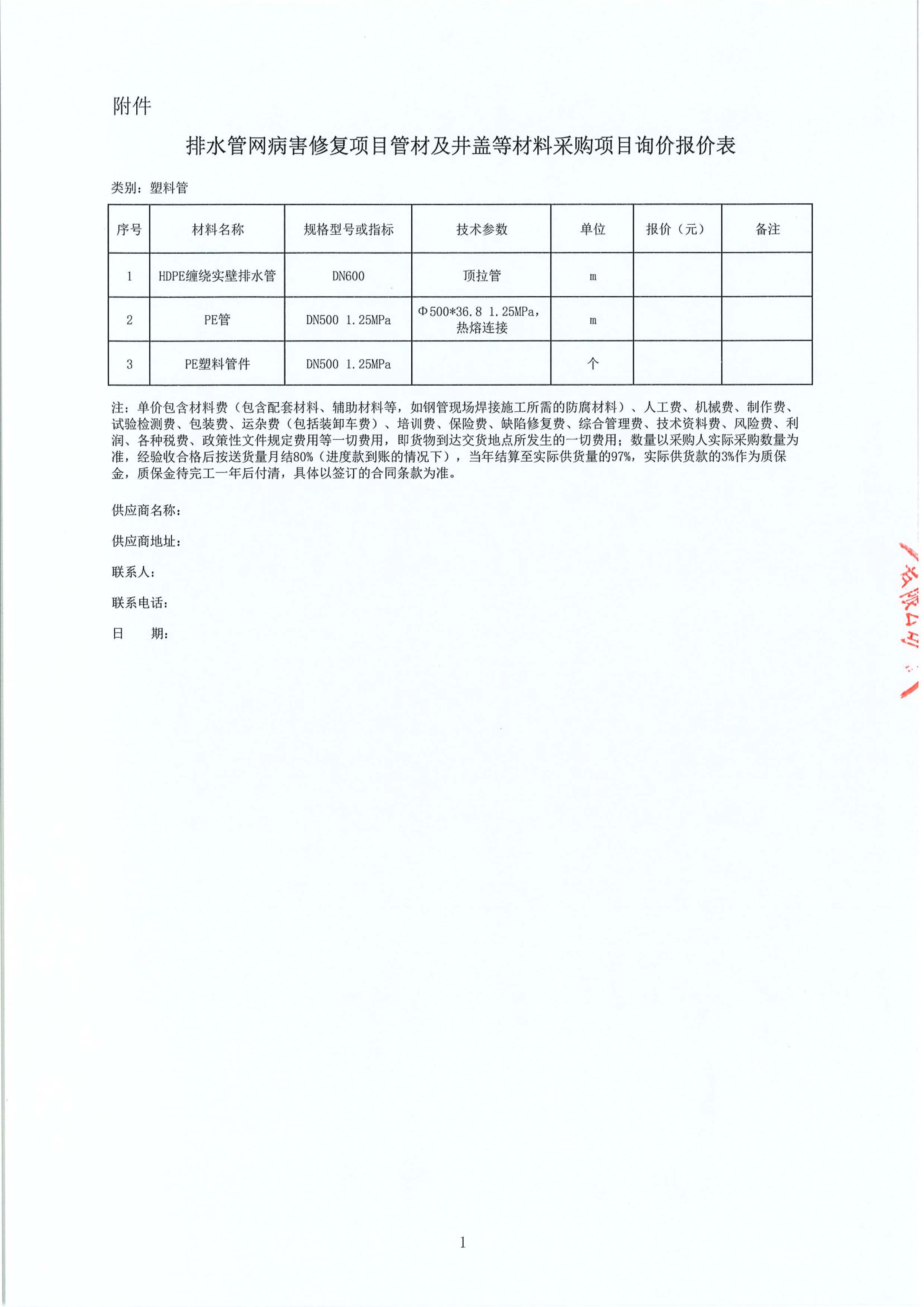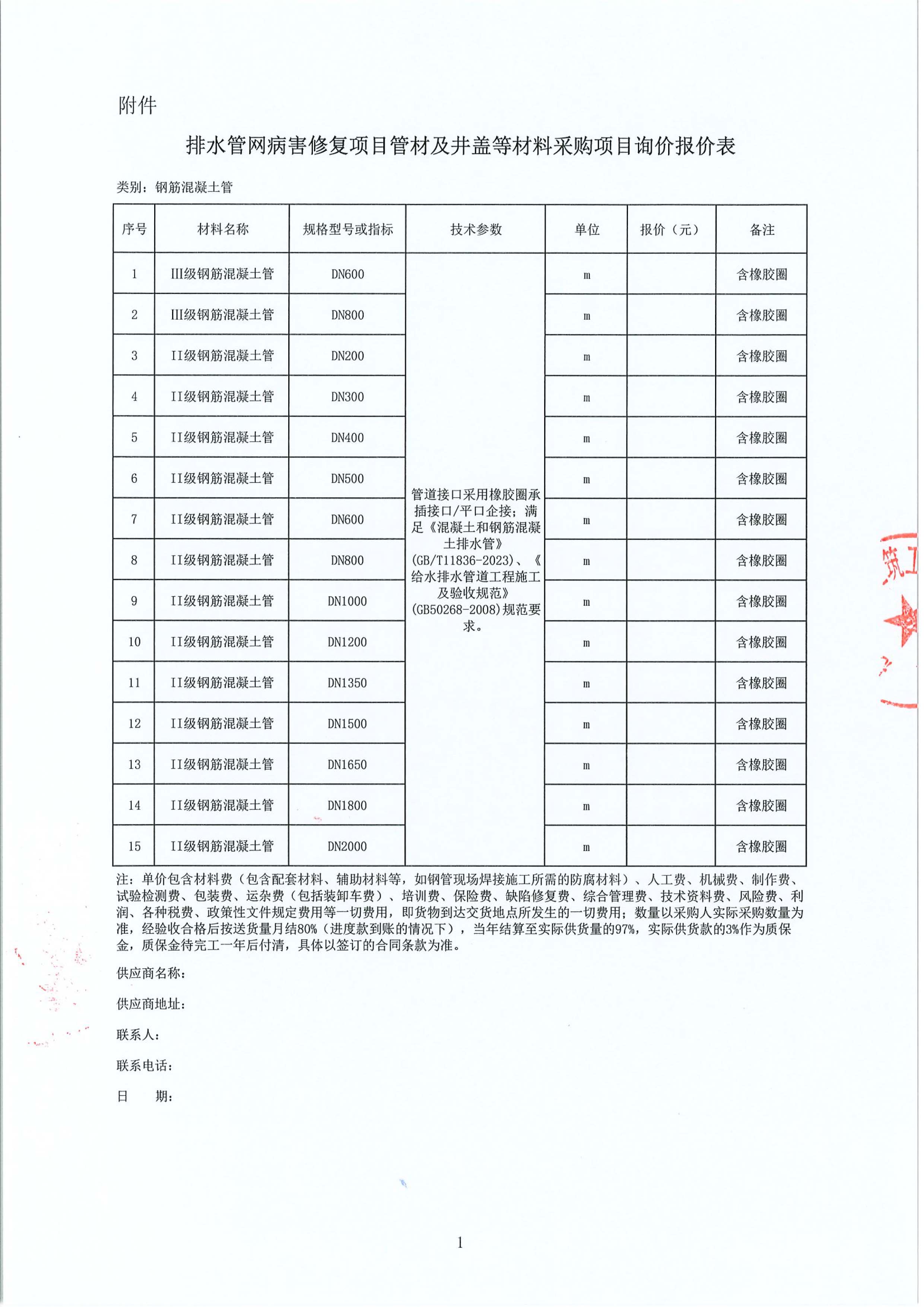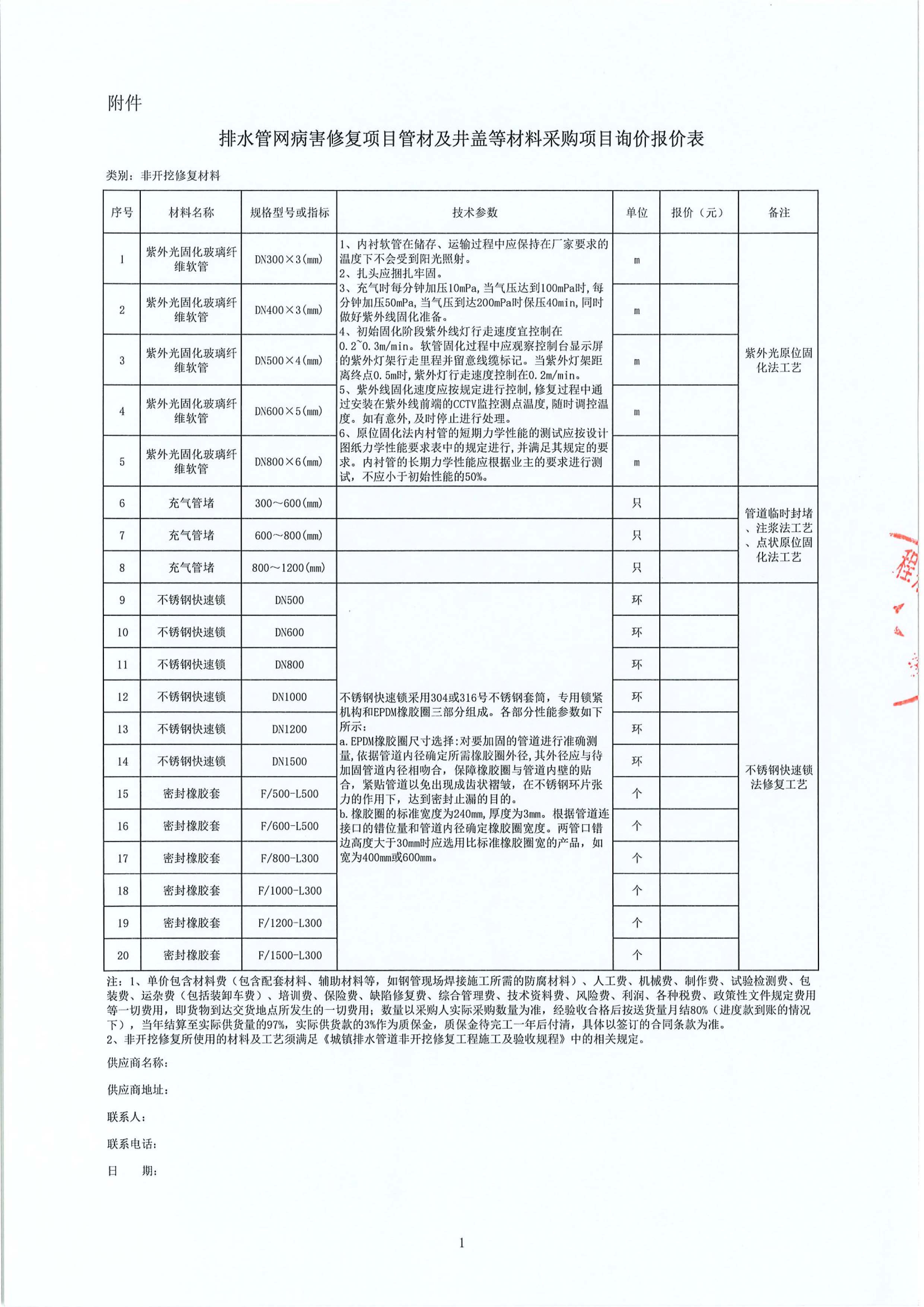 排水管網(wǎng)病害修復(fù)項目管材及井蓋等材料采購項目詢價公告附件: