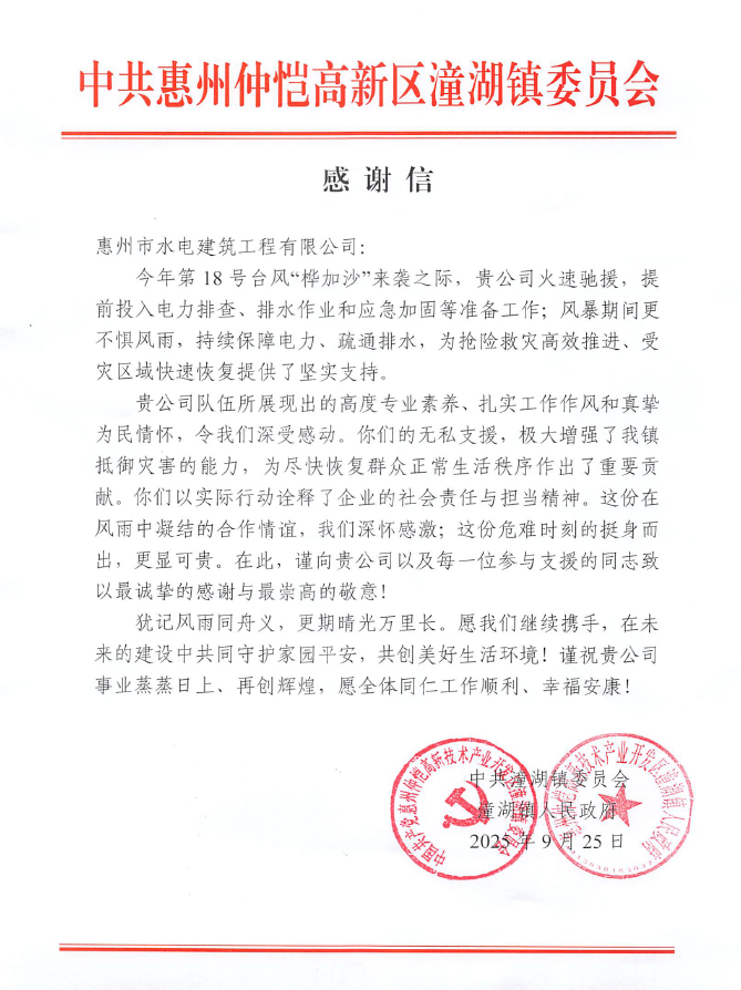 9月26日,仲愷高新區(qū)潼湖鎮(zhèn)政府向水電公司發(fā)來(lái)感謝信,來(lái)信指出,水電公司在第18號(hào)臺(tái)風(fēng)“樺加沙”來(lái)襲之際,火速馳援,提前投入電力排查、排水作業(yè)和應(yīng)急加固等準(zhǔn)備工作;風(fēng)暴期間更不懼風(fēng)雨,持續(xù)保障電力、疏通排水,為搶險(xiǎn)救災(zāi)高效推進(jìn)、受災(zāi)區(qū)域快速恢復(fù)提供了堅(jiān)實(shí)支持,體現(xiàn)了高度專業(yè)素養(yǎng)、扎實(shí)工作作風(fēng)和真摯為民情懷。