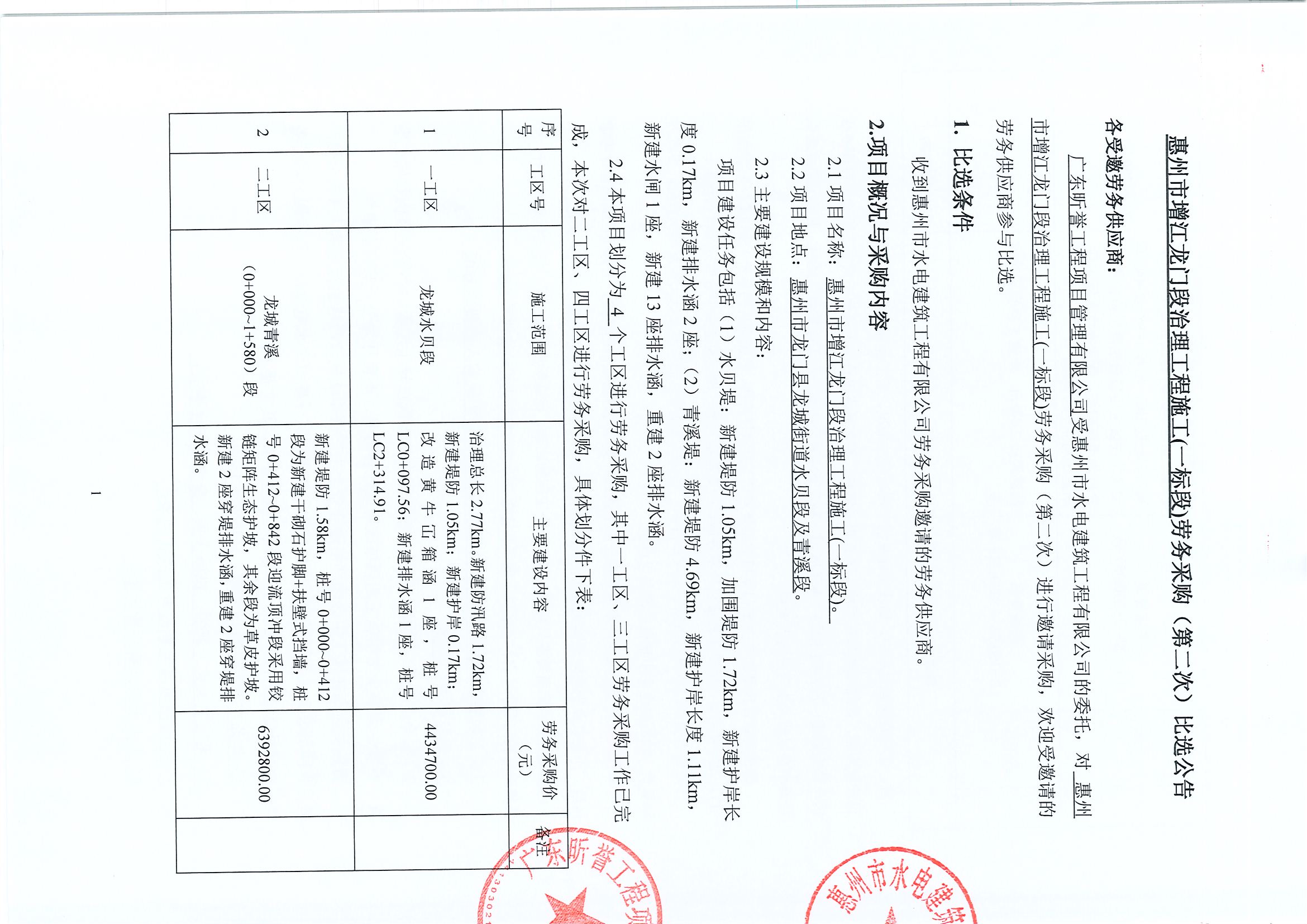 惠州市增江龍門段治理工程施工(一標(biāo)段)勞務(wù)采購(gòu)(第二次)比選公告