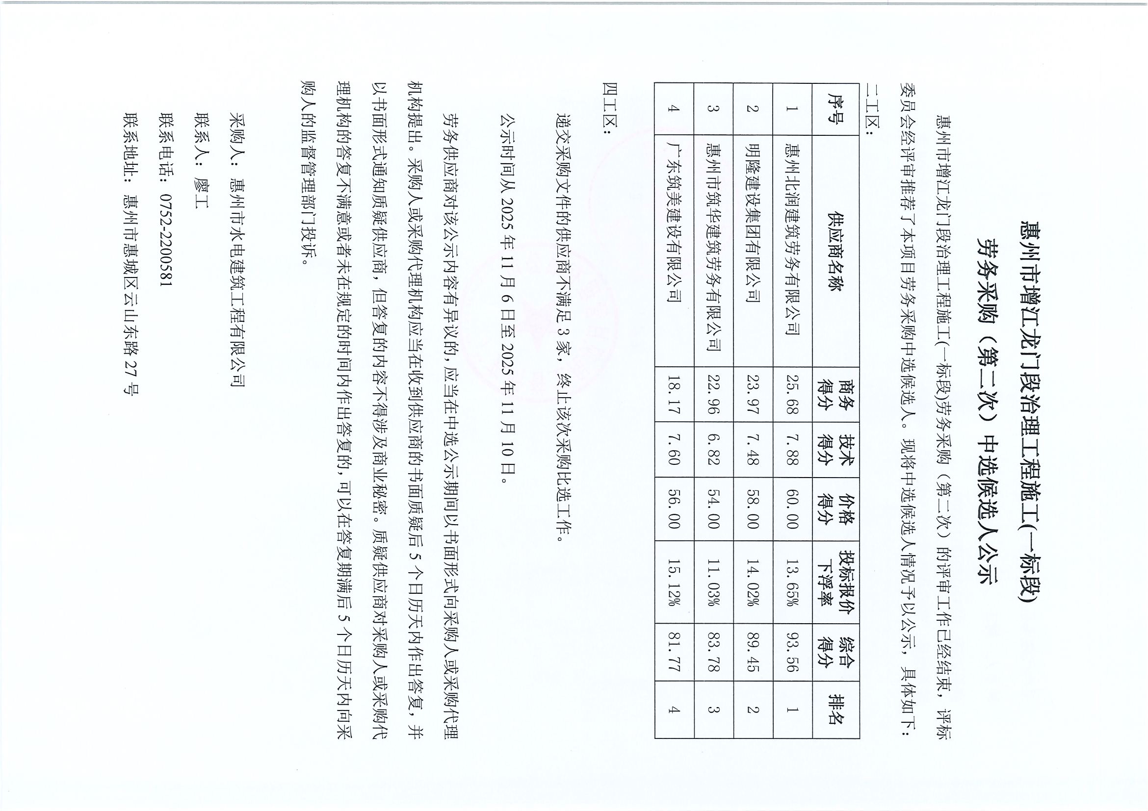 惠州市增江龍門段治理工程施工(一標段) 勞務采購(第二次)中選候選人公示