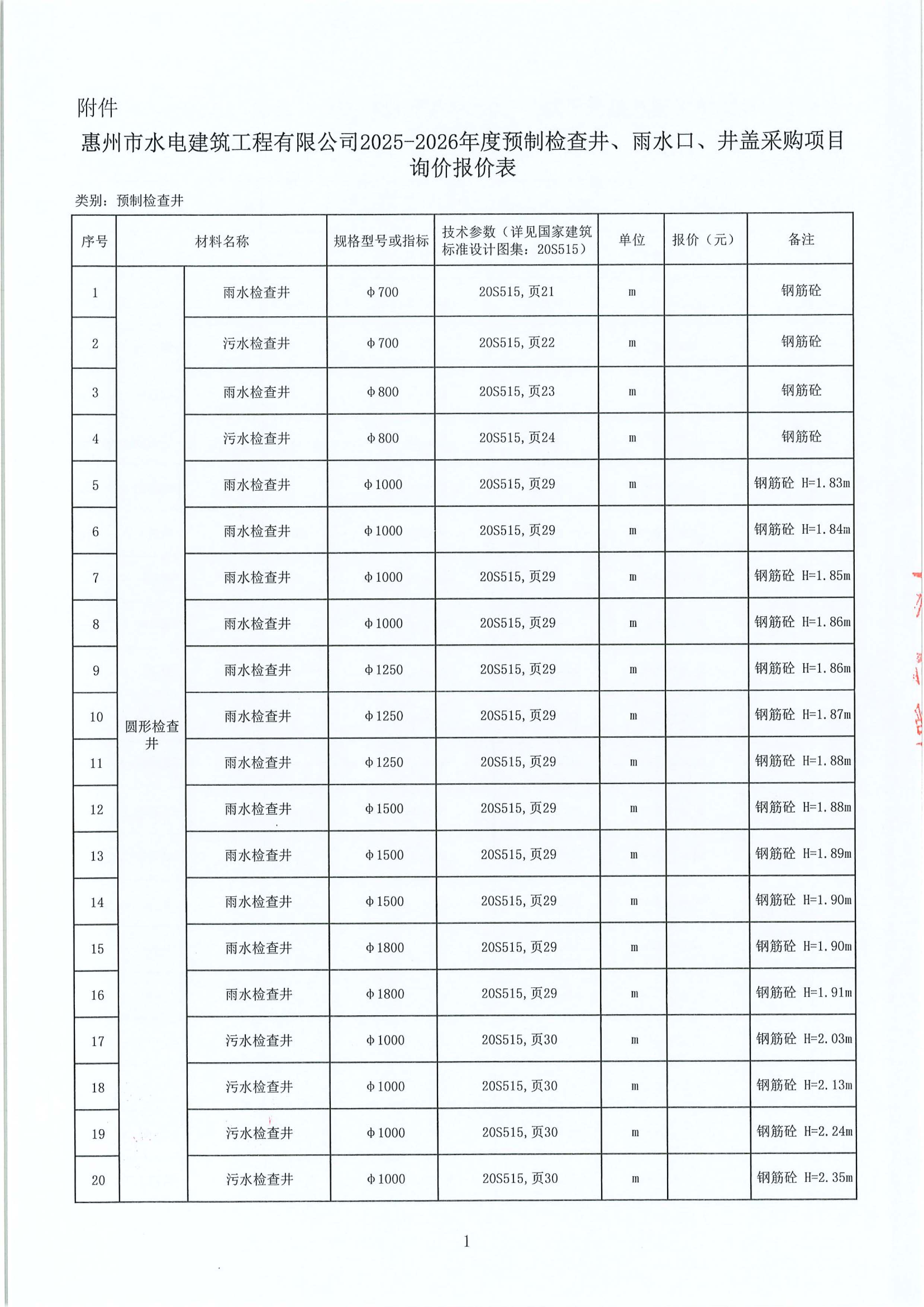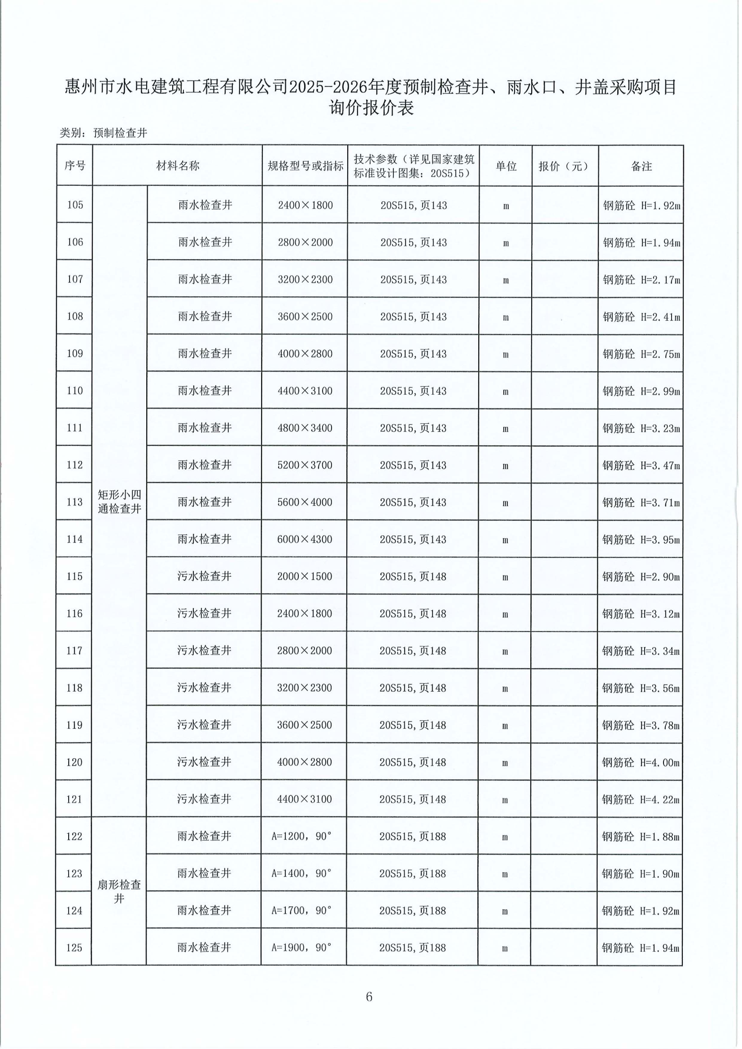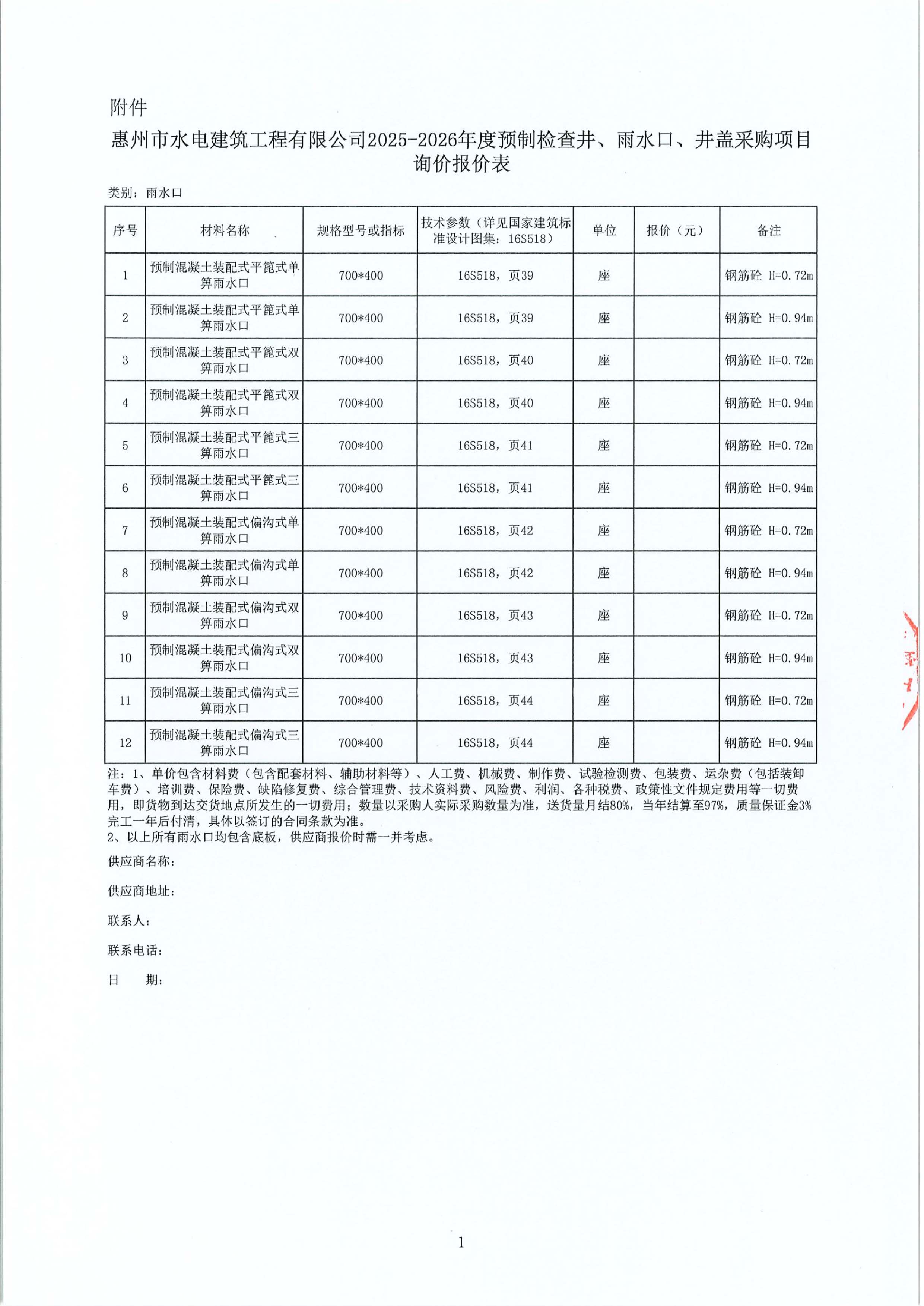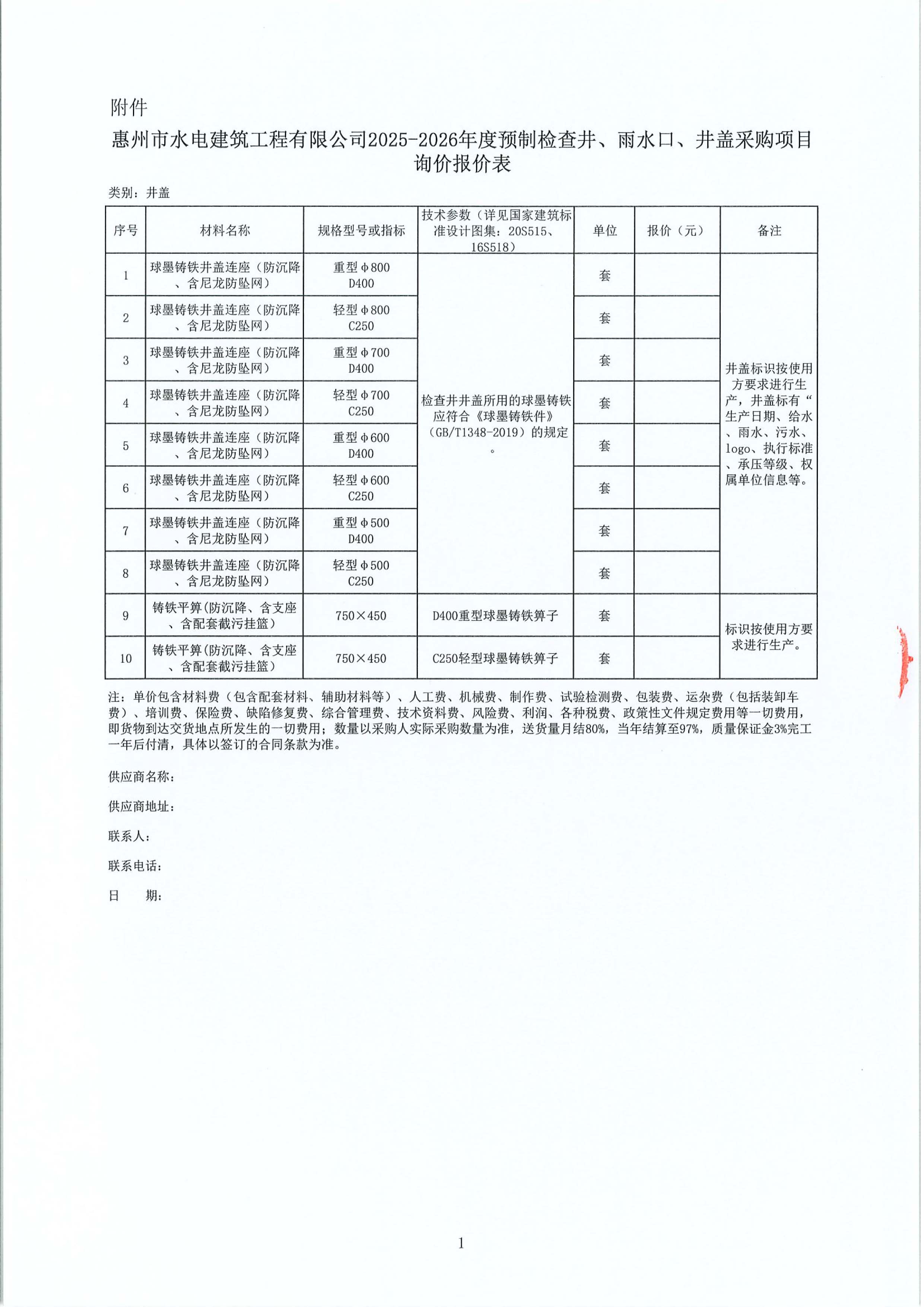 惠州市水電建筑工程有限公司2025-2026年度預(yù)制檢查井、雨水口、井蓋采購項目詢價公告附件: