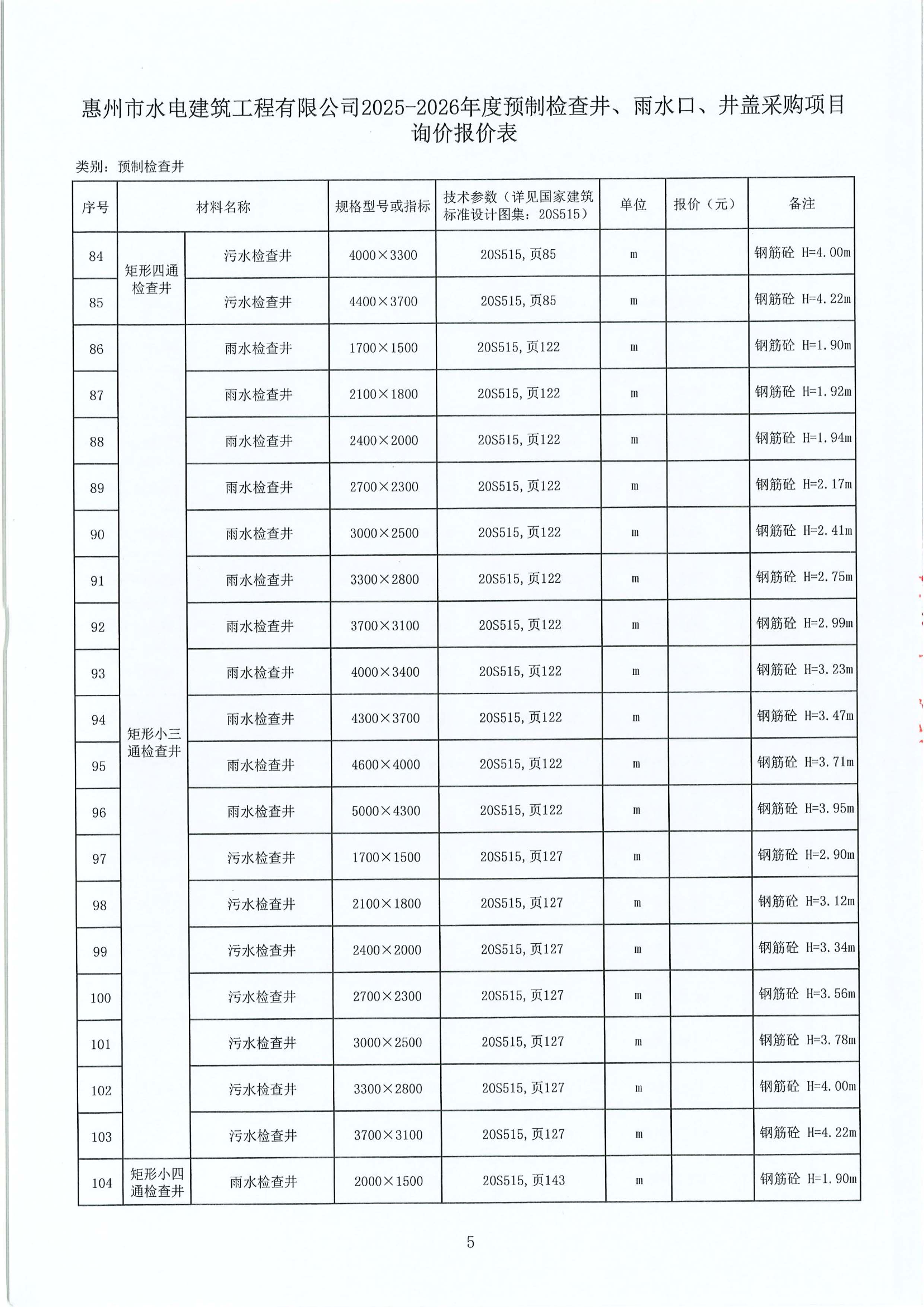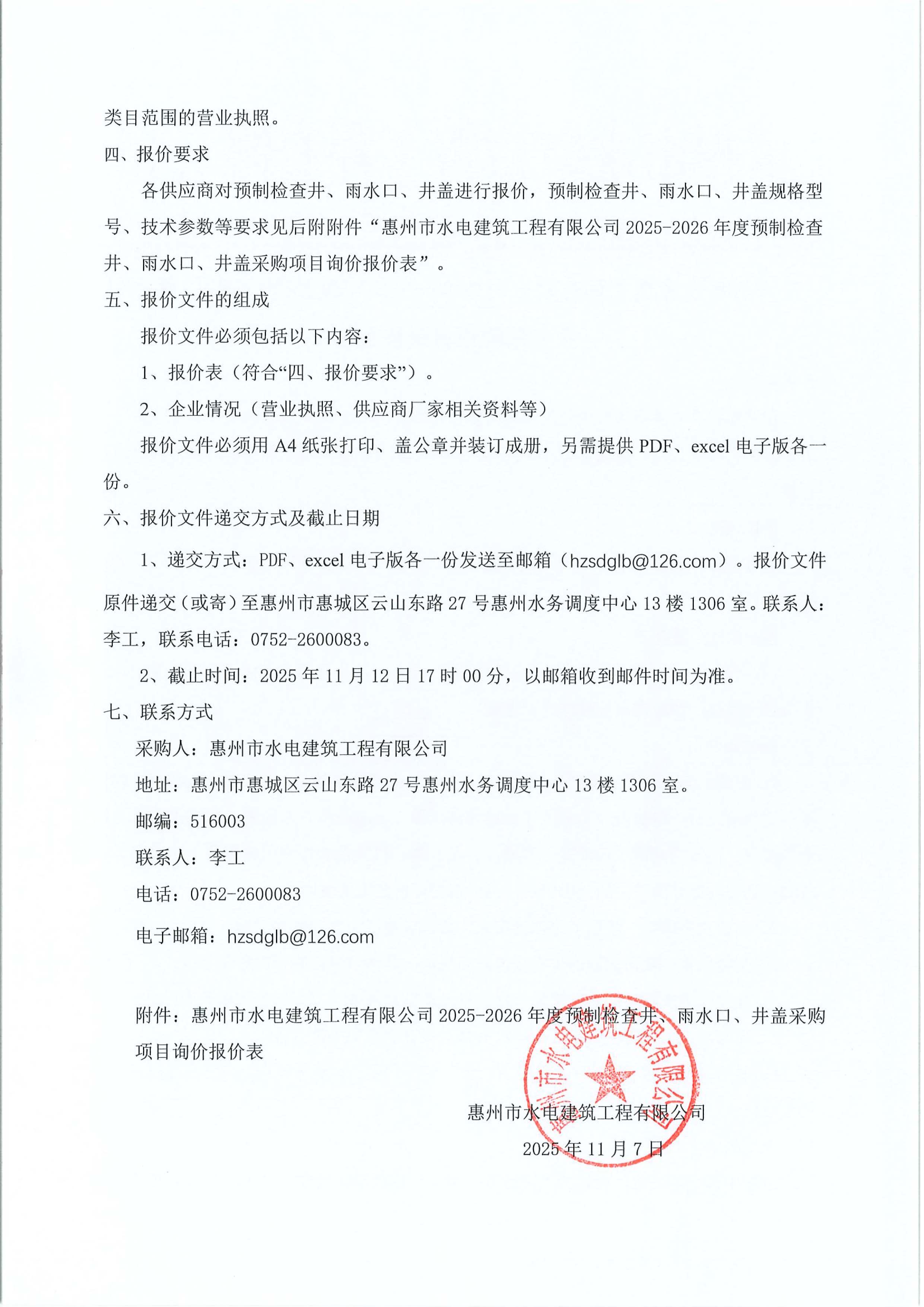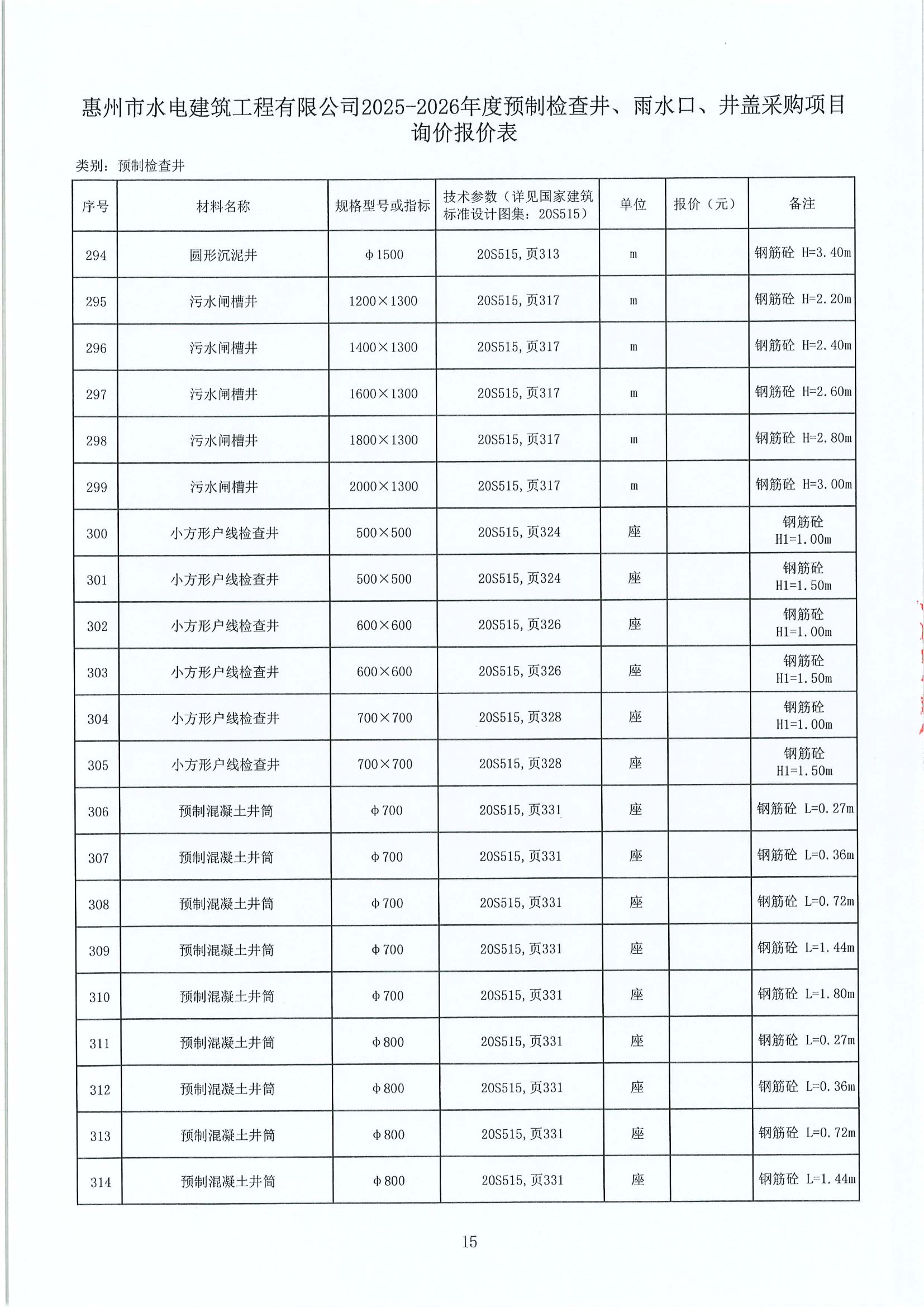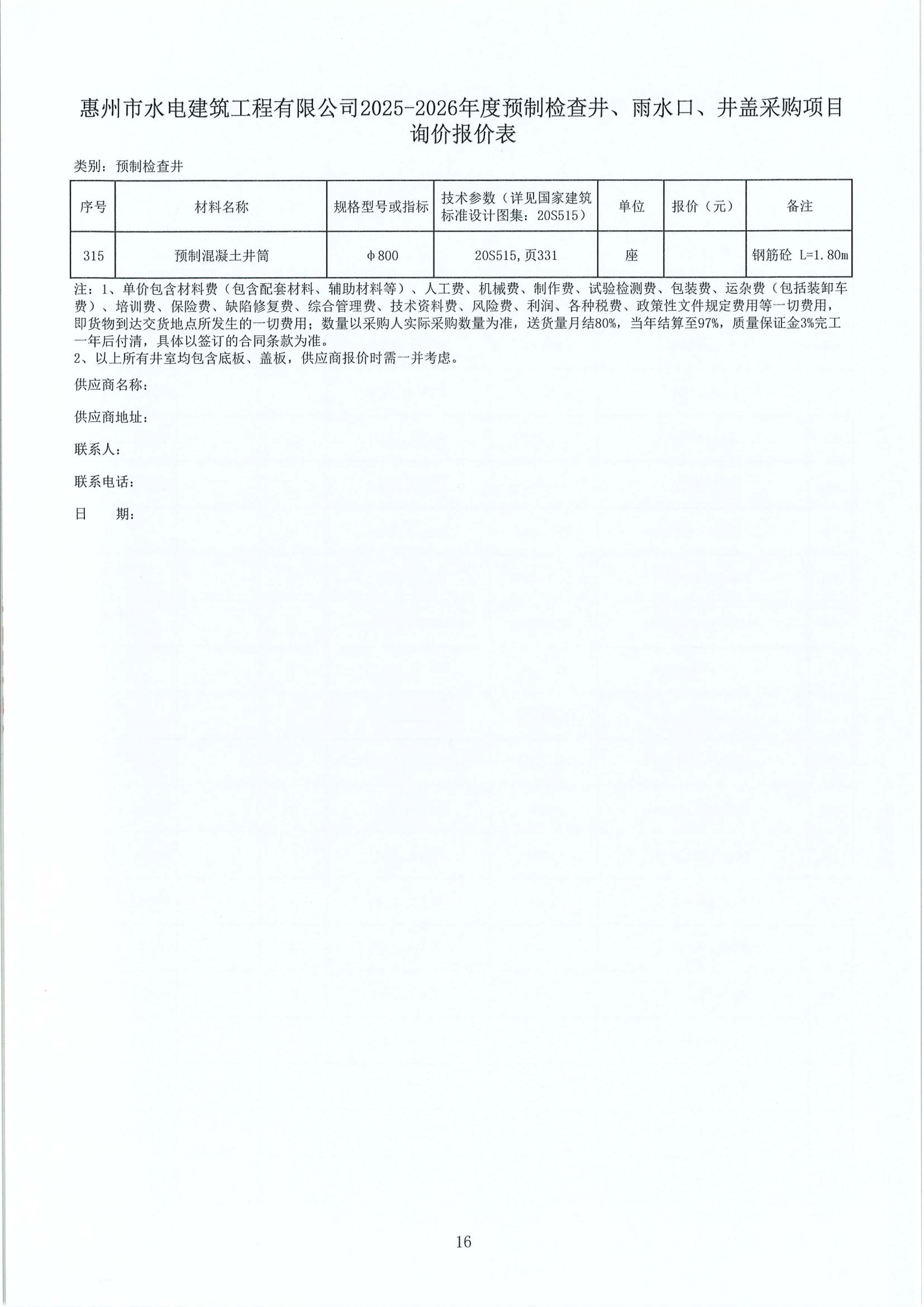 惠州市水電建筑工程有限公司2025-2026年度預(yù)制檢查井、雨水口、井蓋采購項目詢價公告附件: