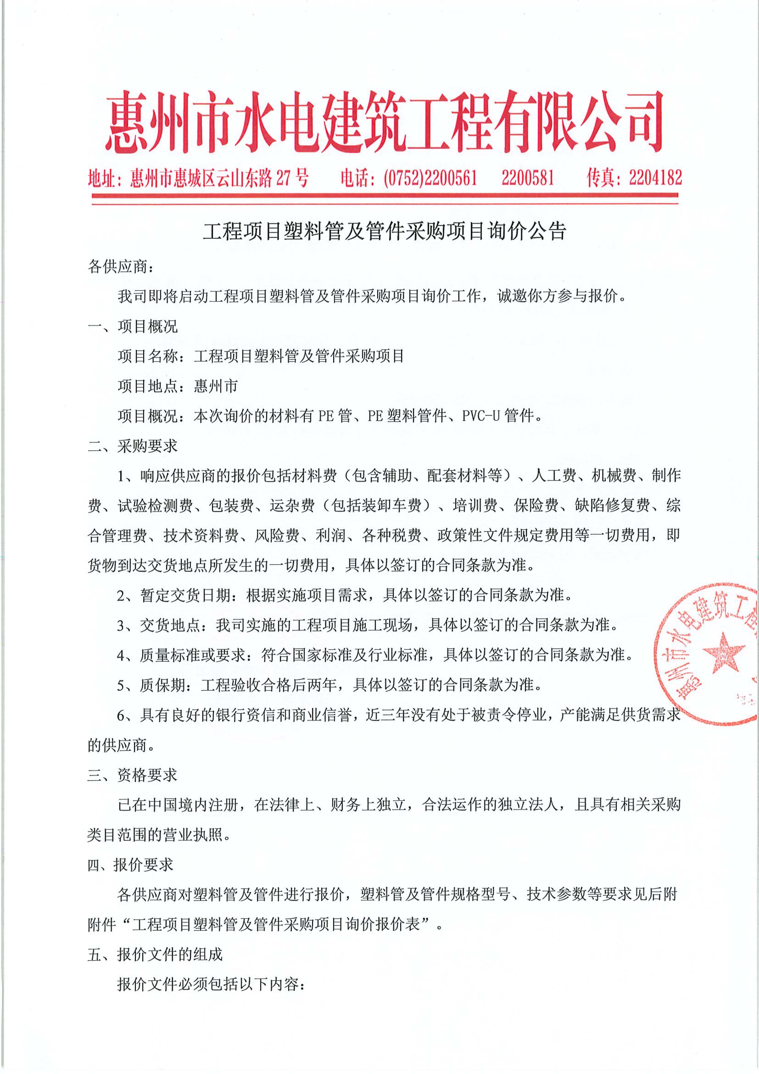 工程項(xiàng)目塑料管及管件采購項(xiàng)目詢價公告