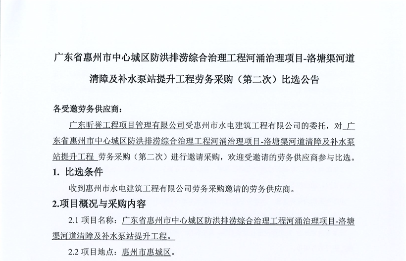 廣東省惠州市中心城區(qū)防洪排澇綜合治理工程河涌治理項(xiàng)目-洛塘渠河道清障及補(bǔ)水泵站提升工程勞務(wù)采購(gòu)(第二次)比選公告......