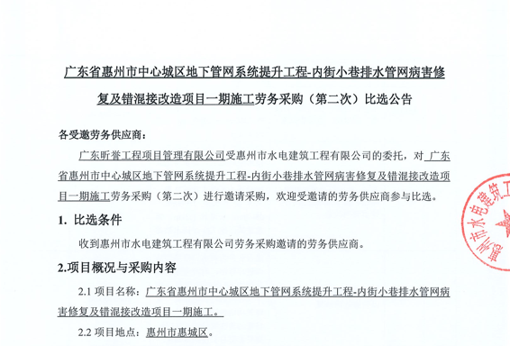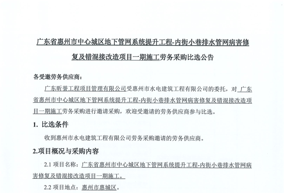 廣東省惠州市中心城區(qū)地下管網(wǎng)系統(tǒng)提升工程-內(nèi)街小巷排水管網(wǎng)病害修復(fù)及錯(cuò)混接改造項(xiàng)目一期施工勞務(wù)采購(gòu)比選公告......