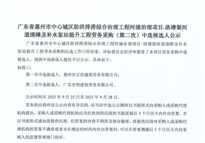 廣東省惠州市中心城區(qū)防洪排澇綜合治理工程河涌治理項(xiàng)目-洛塘渠河道清障及補(bǔ)水泵站提升工程勞務(wù)采購(gòu)(第二次)中選候選人公示......