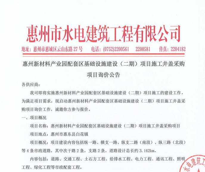 惠州新材料產(chǎn)業(yè)園配套區(qū)基礎(chǔ)設(shè)施建設(shè)(二期)項(xiàng)目施工井蓋采購(gòu)項(xiàng)目詢(xún)價(jià)公告......