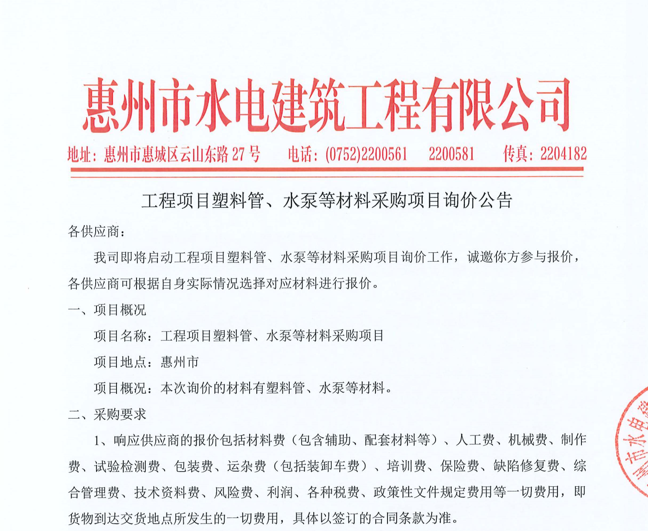 工程項(xiàng)目塑料管、水泵等材料采購(gòu)項(xiàng)目詢(xún)價(jià)公告......