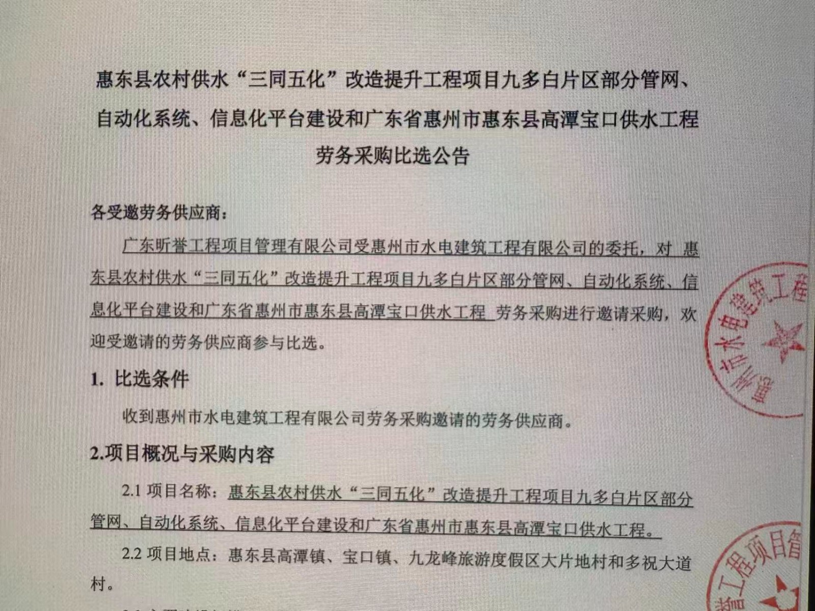惠東縣農(nóng)村供水“三同五化”改造提升工程項(xiàng)目九多白片區(qū)部分管網(wǎng)、自動(dòng)化系統(tǒng)、信息化平臺(tái)建設(shè)和廣東省惠州市惠東縣高潭寶口供水工程勞務(wù)采購(gòu)比選公告......