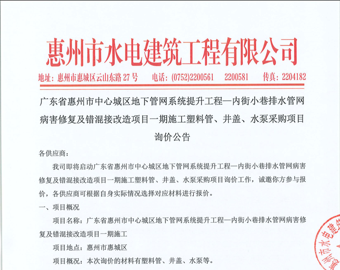 廣東省惠州市中心城區(qū)地下管網(wǎng)系統(tǒng)提升工程—內(nèi)街小巷排水管網(wǎng)病害修復(fù)及錯(cuò)混接改造項(xiàng)目一期施工塑料管、井蓋、水泵采購(gòu)項(xiàng)目詢價(jià)公告......
