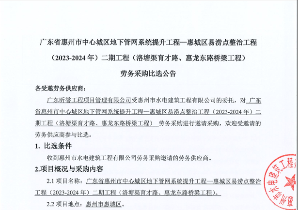 廣東省惠州市中心城區(qū)地下管網(wǎng)系統(tǒng)提升工程—惠城區(qū)易澇點(diǎn)整治工程(2023-2024年)二期工程(洛塘渠育才路、惠龍東路橋梁工程)勞務(wù)采購(gòu)比選公告......