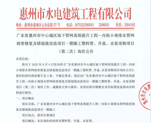 廣東省惠州市中心城區(qū)地下管網(wǎng)系統(tǒng)提升工程—內(nèi)街小巷排水管網(wǎng)病害修復(fù)及錯(cuò)混接改造項(xiàng)目一期施工塑料管、井蓋、水泵采購(gòu)項(xiàng)目(第二次)詢價(jià)公告......