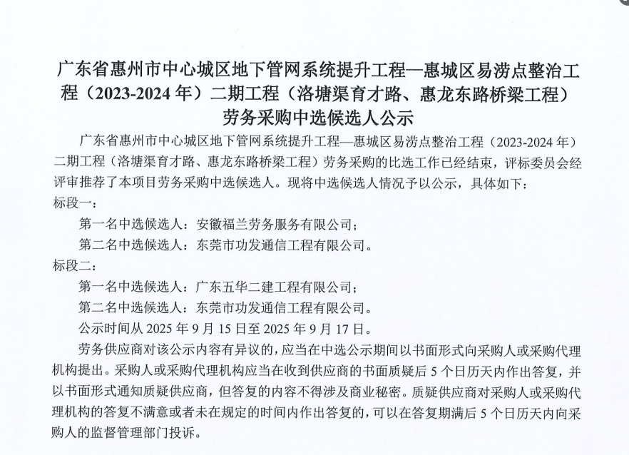 廣東省惠州市中心城區(qū)地下管網(wǎng)系統(tǒng)提升工程—惠城區(qū)易澇點(diǎn)整治工程(2023-2024年)二期工程(洛塘渠育才路、惠龍東路橋梁工程)勞務(wù)采購(gòu)中選候選人公示......