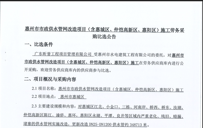 惠州市市政供水管網(wǎng)改造項(xiàng)目(含惠城區(qū)、仲愷高新區(qū)、惠陽(yáng)區(qū))施工勞務(wù)采購(gòu)比選公告......