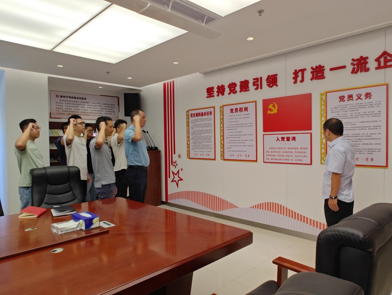 活動(dòng)最后,在黨支部書記的領(lǐng)誓下,全體黨員面向鮮紅的中國(guó)共產(chǎn)黨黨旗,舉起右拳莊嚴(yán)宣誓:“我志愿加入中國(guó)共產(chǎn)黨,擁護(hù)黨的綱領(lǐng),遵守黨的章程,履行黨員義務(wù)……”鏗鏘有力的誓言回蕩在活動(dòng)現(xiàn)場(chǎng),不僅是對(duì)入黨初心的重溫,更是對(duì)傳承抗戰(zhàn)精神、踐行使命擔(dān)當(dāng)?shù)泥嵵爻兄Z。黨員們表示,將以此次主題黨日活動(dòng)為契機(jī),牢記歷史、不負(fù)韶華,在施工一線攻堅(jiān)克難、勇挑重?fù)?dān),以實(shí)際行動(dòng)踐行入黨誓詞,讓偉大抗戰(zhàn)精神在新時(shí)代水電建筑征程中煥發(fā)光彩。